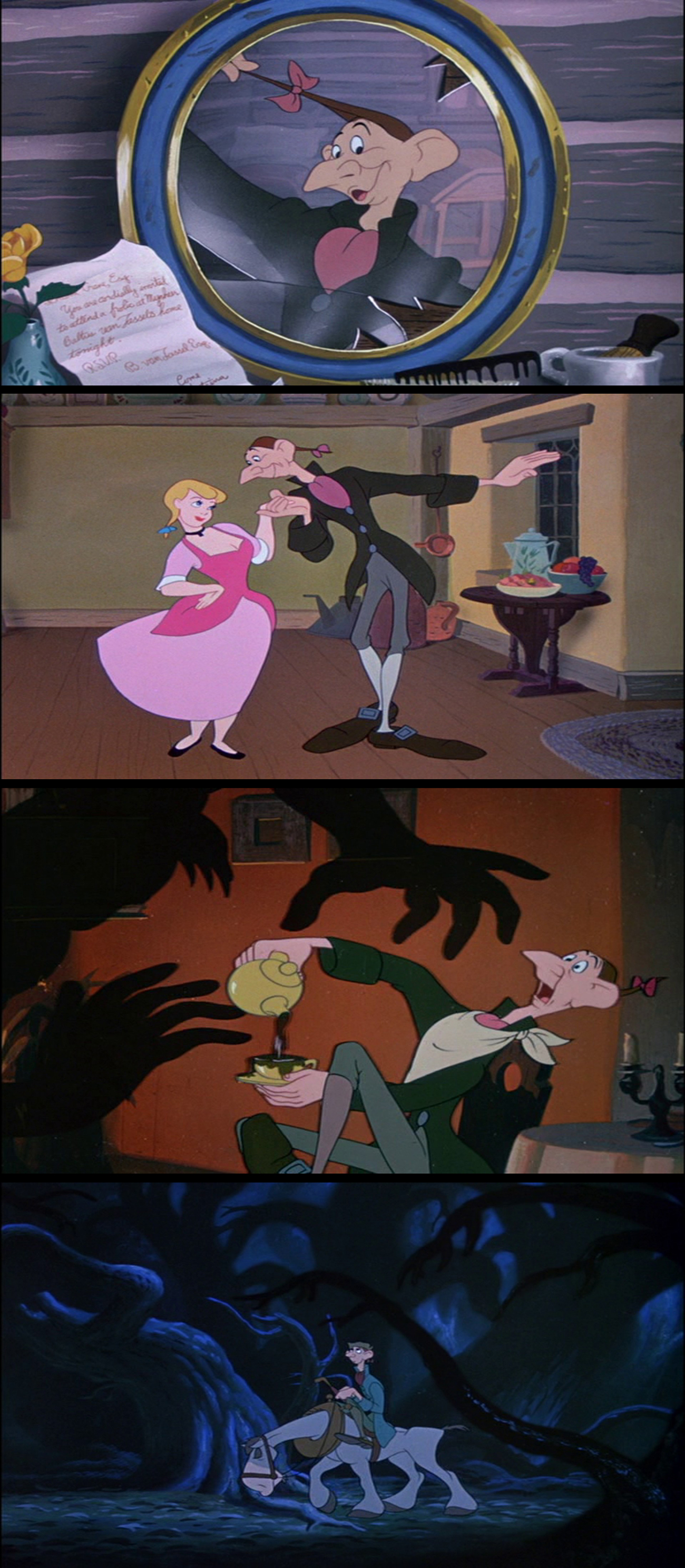 Also, like many of the classic Disney movies from their golden era, the songs are catchy and spirited. While the story progresses with some of the familiar good-humored Disney slapstick, the main story is very much about a love triangle of sorts, where Ichabod is craving Katrina’s affection and does everything he can to flirt with her, making her fiancé jealous. Katrina, on the other hand, is obviously enjoying Brom’s jealousy and is only using Ichabod to fuel his anger…“that little coquette Katrina“ isn’t as sweet on the inside as on the outside, it seems. Then again, this isn’t really a story about the sweetest and most sympathetic characters. Ichabod comes off as a selfish, ruthless gold-digger who yearns more for Katrina’s wealth than her, literally daydreaming of when her father will die (!), and Katrina herself only plays along to tease Brom which makes her a bit of an attention-seeking bitch.