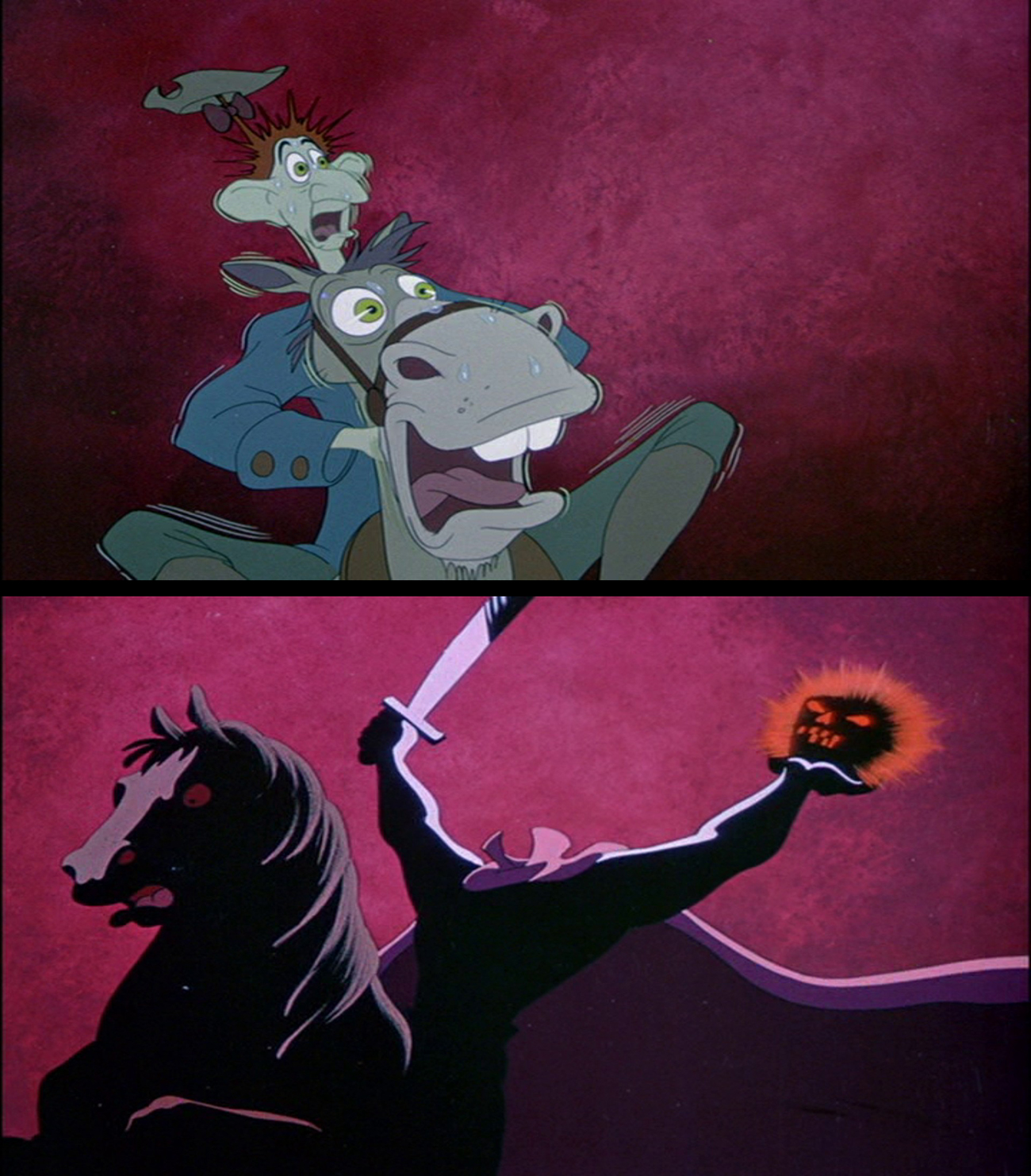 The best part of the movie begins, of course, once Brom starts singing one of Disney’s darkest songs: Headless Horseman. This is such a perfect Halloween banger and sets such a dark mood and foreshadowing of what is to come. Which is, of course, Ichabod’s travel back home where he gets to meet the infamous ghost that haunts Sleepy Hollow every Halloween night. Here the animators really excels with use vibrant colors and contrasts to make an eerie and spooky atmosphere!