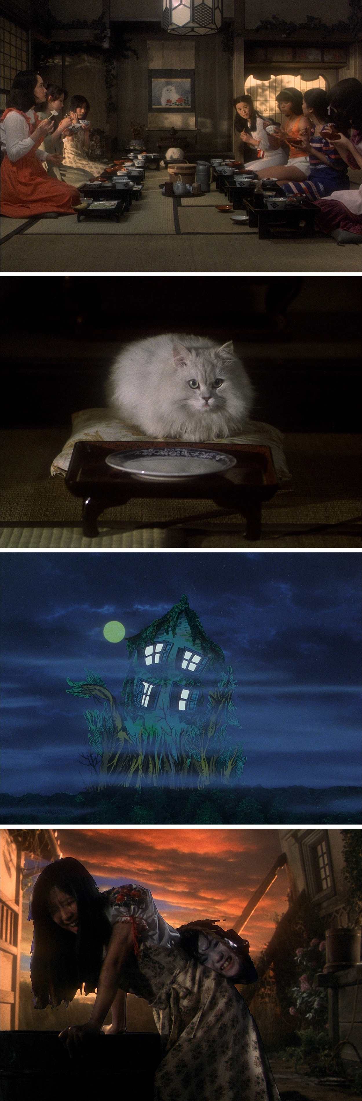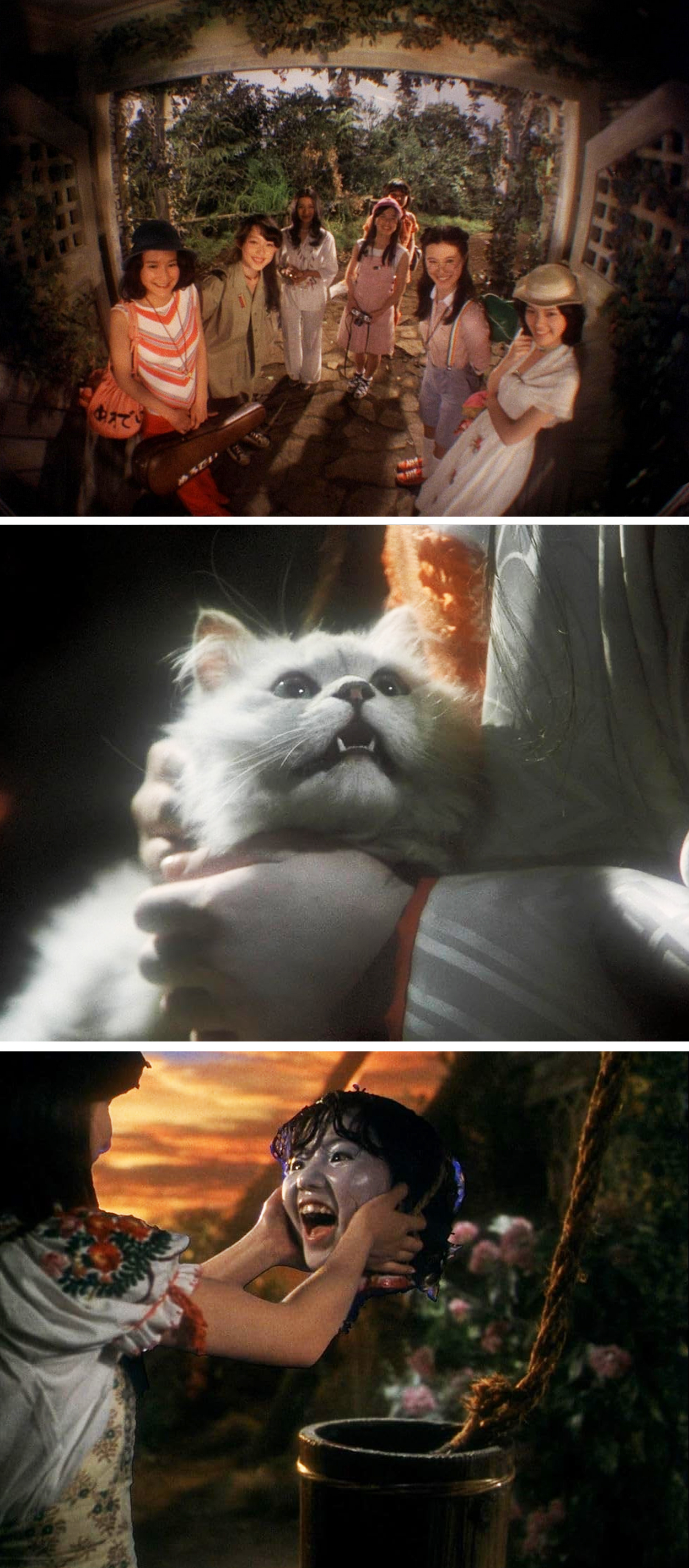 Toho Studios contacted Obayashi because they wanted to make a movie like Jaws and needed ideas. Okey-dokey then. If Obayashi was an Italian he would probably gone ahead and urged Toho to make a shark film and call it Jaws 2, but we’re in Japan, where the craziest ideas are allowed to take form! So he went to his pre-teen daughter Chigumi for ideas, under the presumption that adults only think about things they understand, so everything stays on a boring human level while children can come up with the strangest things that defy explanation. Thus, sharks and beaches were replaced with a fluffy white cat and a spooky country house that eat girls. Obayashi also used some of his childhood as inspiration for some of the key elements in the movie. He was born in Hiroshima, and during the atomic bombings he lost all his childhood friends. He decided to use these themes into the plot of the film, by creating a plot element of a woman’s ghost waiting for her love to return back home from World War II, a wait that lasted forever since her lover died, and this turned her into an evil spirit. The ideas were given to Chiho Katsura, who then wrote the script for the film.