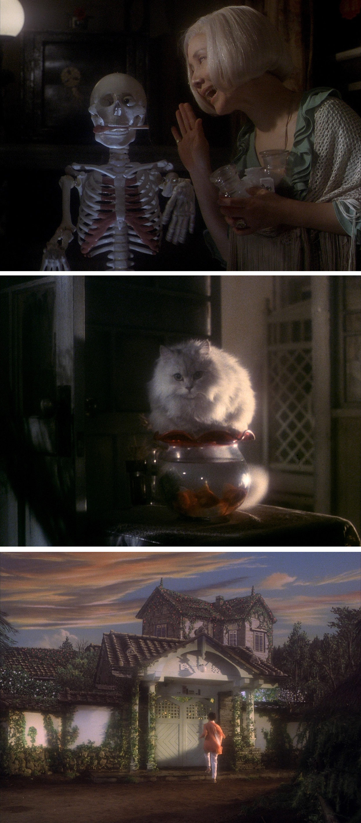 On the way to auntie’s house they bring along a white, fluffy cat, who appears to the aunt’s harbinger of sorts. Prior to getting to the aunt’s cozy country house, they meet a watermelon seller who could’ve more or less been the “don’t go to the house“ kind of guy, but which does the opposite and tells them exactly how to get there. Greeting the girls in a wheelchair, the aunt seems to be very happy to welcome them. The always hungry Mac had of course bought a Watermelon from the seller they met earlier, and brings it as a gift which they leave in a well to keep it cold. And from now on, it doesn’t take long before everything inside the house turns into a spookfest of the purest insanity! It all starts with Mac going out to retrieve the watermelon, and doesn’t return. Worried, Fantasy goes to check on her, only to find Mac’s disembodied head which flies into the air and bites Fantasy in the butt. Nobody believes her, of course, but soon all kinds of supernatural shenanigans are happening all around the house, which is all so gaga loony that nothing can really prepare you for the enchantment of the House and its white fluffy kitty!