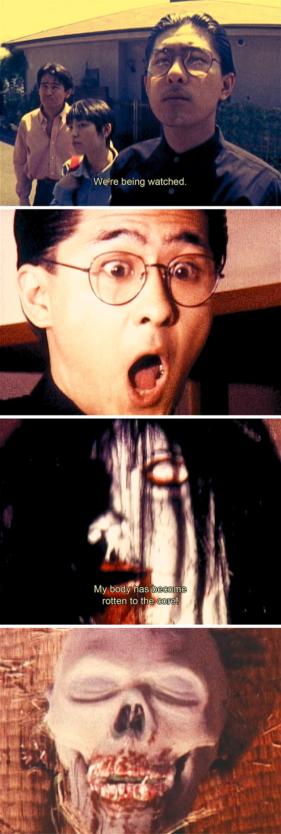 We meet the young hunky bodybuilder Shinji, not Ashu, (played by the director himself) and his ex-girlfriend and paranormal journalist Mika. Since Shinji is without a job and has nothing better to do than pump iron, he tags along with Mika to investigate a local haunted house. They also bring a psychic priest. But this is not just some random house though; it’s the house of Shinji’s dad, who once lived there with a mysterious girlfriend. Aside from the trippy horrorshow that’s around the corner, we also have a lot of dark secrets and lore to be revealed during the one-hour runtime. The film was shot in Shinichi Fukazawa’s parents’ house, and since it was planned to be demolished, the young director got a whole free set on a silver platter to go wild and fire on all cylinders. And so he does.