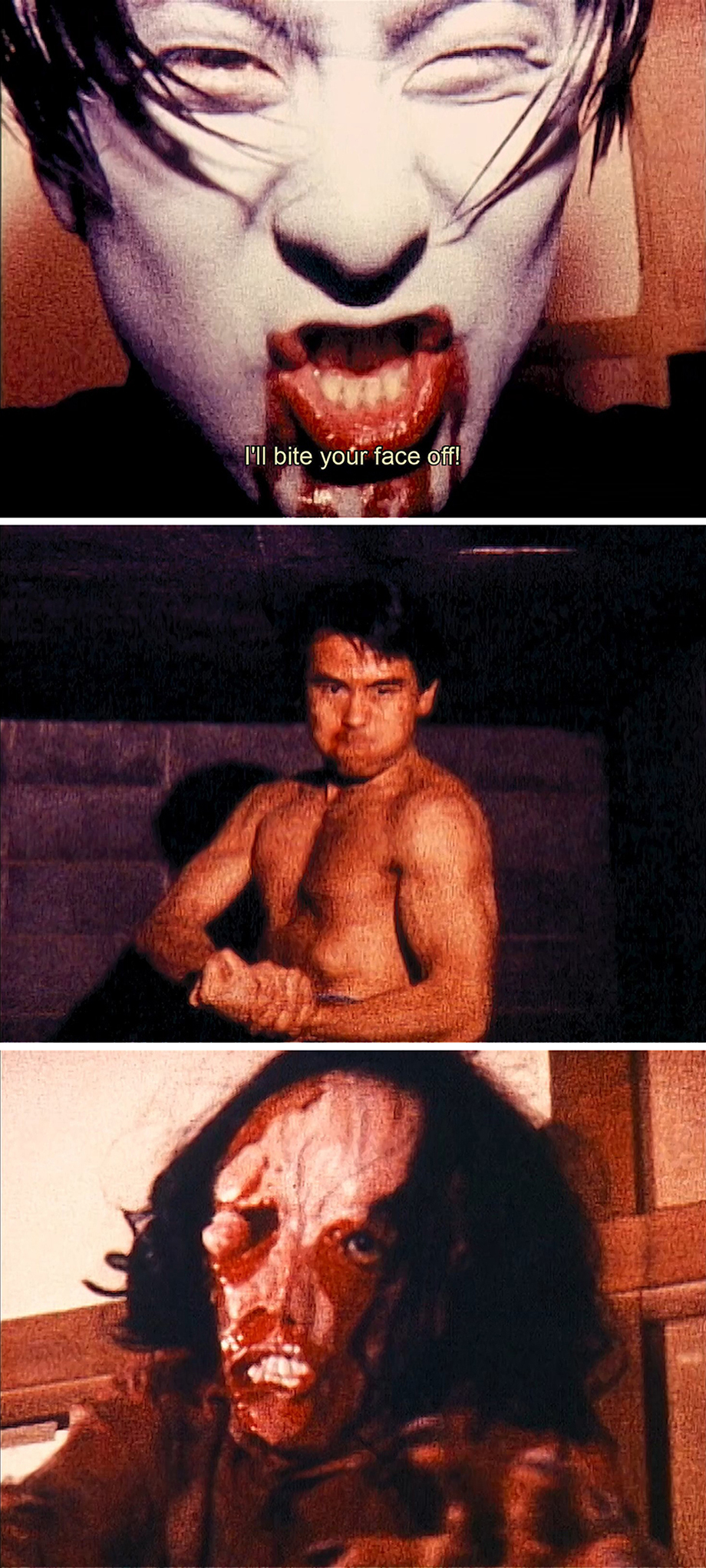 The best way to explain this short and simple, is as if a manic fifteen-year old got his religious calling card after watching Evil Dead, grabbed the parent’s 8mm and made his own magnum opus on pure impulse with his friends in the backyard. In other words: ultra-cheap, very primitive and Z-grade schlocky yet filled with crazy energy and dedicated, stubborn non-stop passion. And when it’s also from Planet Japan, you know you’re in for something extra and special. The film is written, produced, directed and edited by Shinichi Fukazawa, who of course, plays the bodybuilder from hell. He’s also behind the effects and make-ups. And this is, as we speak, the only film he’s directed.