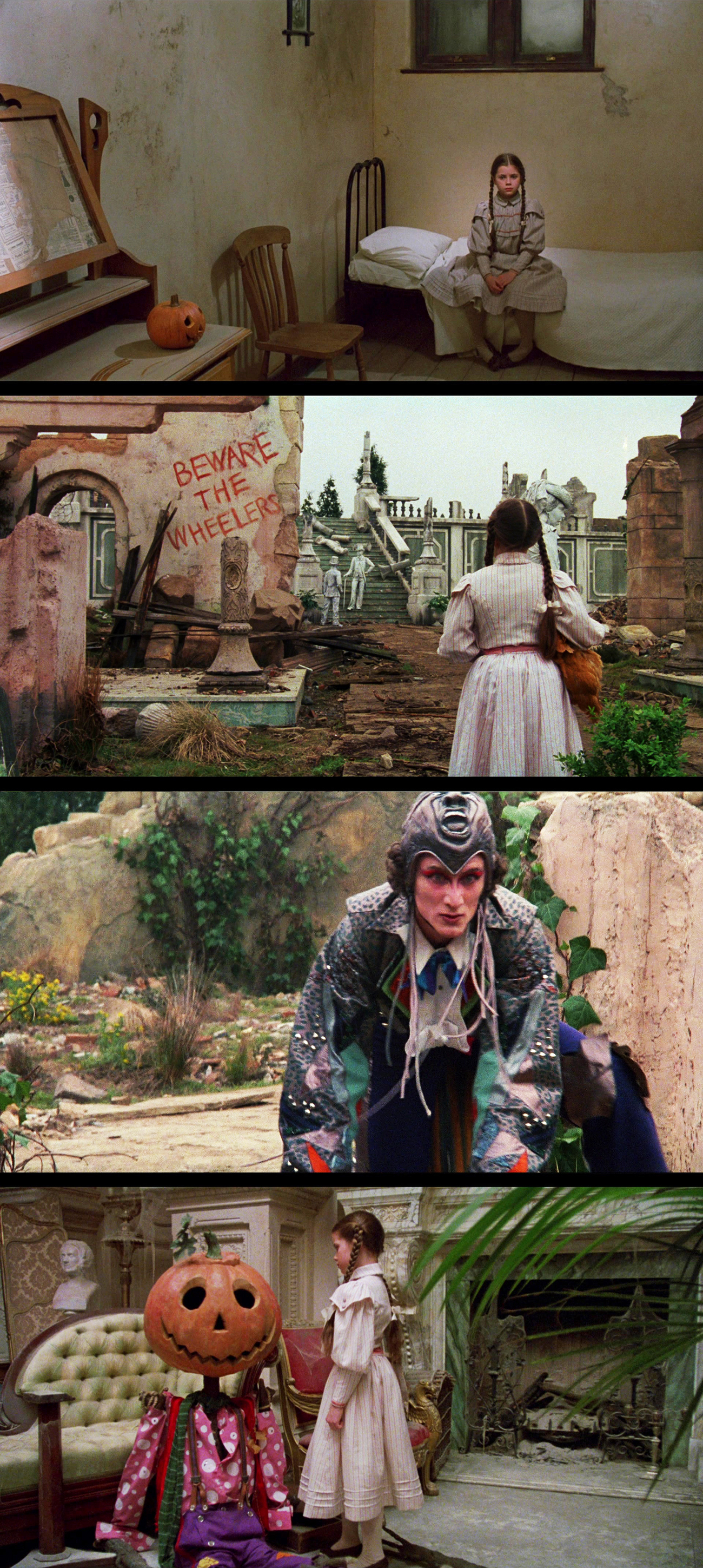 And the next day, she wakes up in the land of Oz where the river has transformed into a puddle. Somewhere along the ride she’s gotten herself a new companion; the talking chicken Billina. After some brief open world exploring, she sees that the yellow brick road has been destroyed, and discovers that the entire Emerald City has been turned into an apocalyptic wasteland by the evil wizard Nome King (Nicol Williamson). The people are turned to stone, several of whose heads are missing. Beware the wheelers are tagged on the walls. Who the hell are the wheelers, you ask? They’re freaks on… wheels, who looks like former band members of Siouxsie and the Banshees. Something from your worst childhood nightmares, plain and simple. And we can only imagine, in a banned X-rated version, what they would do to little girls if they actually had hands. Ugh.