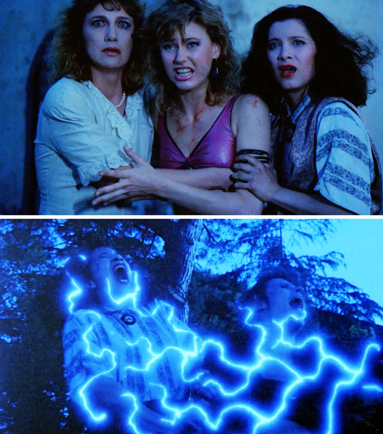 OK. So, uhm, the ghost of Paganini rises from the grave, I guess, to stalk and kill our female rockers one by one with a dagger that sticks out from the bottom of his small violin. Here he’s dressed more like a cheap cosplay version of the phantom of the opera, and is not even close to the awesome-looking ghoulish skeleton we see in the poster. There’s full-on nonsensical dream logic from here on where people randomly fall through green neon-lighted sinkholes, and…well, as we say in showbiz: The show must go on. Don’t have a script, you say? Then improvise! What follows is more retarded acting, cheap effects, cheaper costumes, baffling dialogue delivery and so on. You know the drill..
