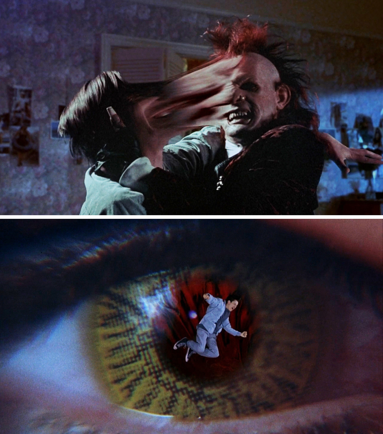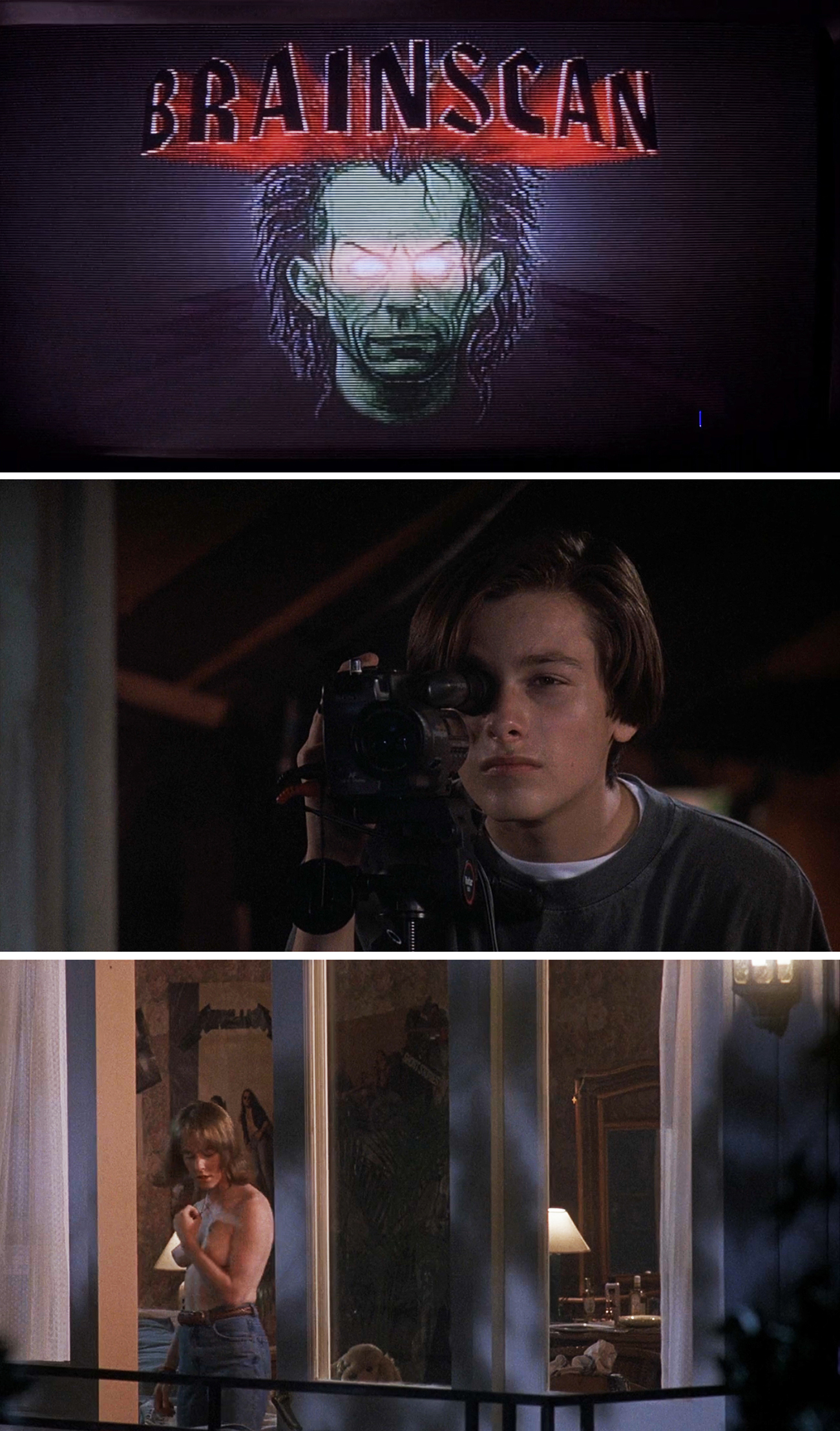 The premise of Brainscan is definitely intriguing. Virtual Reality had its real take-off in popularity during the early 90’s, despite there being several other attempts much earlier, like Morton Heilig’s Sensorama from the 1950’s, which was an arcade-style theatre cabinet with stereo speakers, stereoscopic 3D display, generators for smells and a vibrating chair (ladies must’ve loved that particular feature), and Ivan Sutherland’s Ultimate Display concept, for example. For a very long time, we have been fascinated with the idea of experiencing some kind of reality where one could experience things that are not possible in the real world…or do things without any consequences. So the idea of a Virtual Reality game, so real that it feels like life itself, is a concept that probably felt both near and far in the early 90’s. And this movie really tries to show Michael off as some real high-tech boy with all the latest gadgets, having a large room in the attic/upper floor filled with video game, heavy metal and horror memorabilia. He even has his own computer-Igor answering his phone calls and all (if I had watched this movie as a kid, I would’ve been envious as fuck). Still, it’s one of those typical 90’s movie settings where the high tech almost seem a little alternative-reality like…there’s just something so weird about movies where imagined near future technology is presented in such an odd old-fashioned way. I kind of find it a little charming, in its own peculiar way.