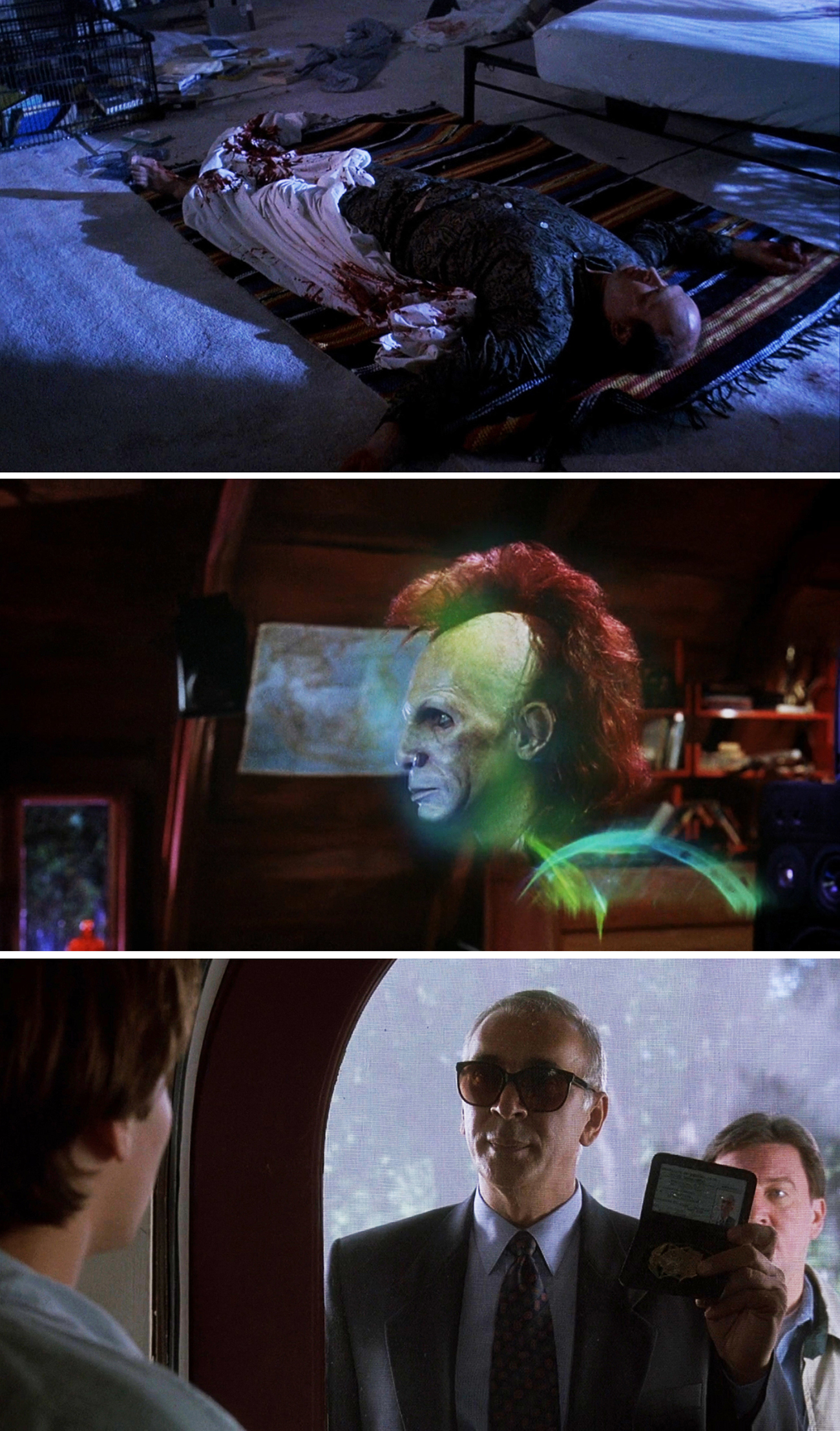 Mike gets taken to the hospital where he falls into a coma. It doesn’t look too good, as he’s walking towards the light in a bright blue hallway among other dead silhouettes. And I’m sure I spotted Tangina and Kane for a second. But one particular sticks out. It’s… Jodi, Mike’s dead big brother, again played by Bill Thornbury. And he looks bored of his mind. After a quick reunion, Jodi tells Mike to stay away from the light and go back. The Tall man shows up and orders him with his strict boooOOOY line delivery to turn back since he wants him alive. Mike wakes up only to get attacked by a ghoulish nurse. Mike shoves a metal pipe through her neck. Reggie comes in and gets her yellow blood spurted all over his face. A sphere forces itself out of her scalp and flies in front of Mike. An eye comes out of the Sphere (yes, they have eyes now) to take a good look at Mike before it flies out of the window. WTF. Just another day in Phantasm land.