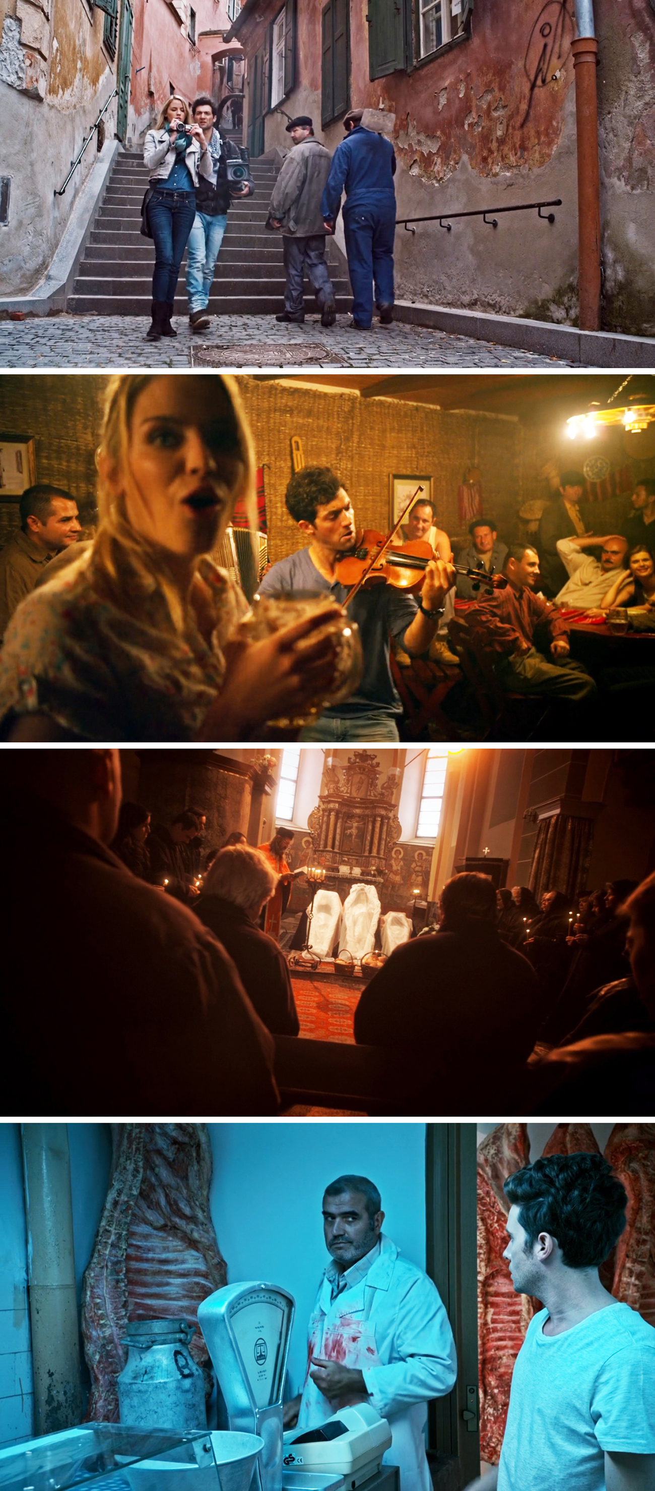 They’re Watching is a found footage horror film from 2016, written and directed by Jay Lender and Micah Wright. While many found footage movies suffers a bit from overused and generic locations (with forests being the most worn-out locations of them all), this movie did at least spice it up a bit with more interesting filming areas, as it’s filmed in Romania. Before heading over to the more generic forest/cabin-in-the-woods stuff, we get to see some villages, cobbled streets, locals, and even a restaurant scene where the actors are actually playing the instruments and the audio was recorded live. Fun!